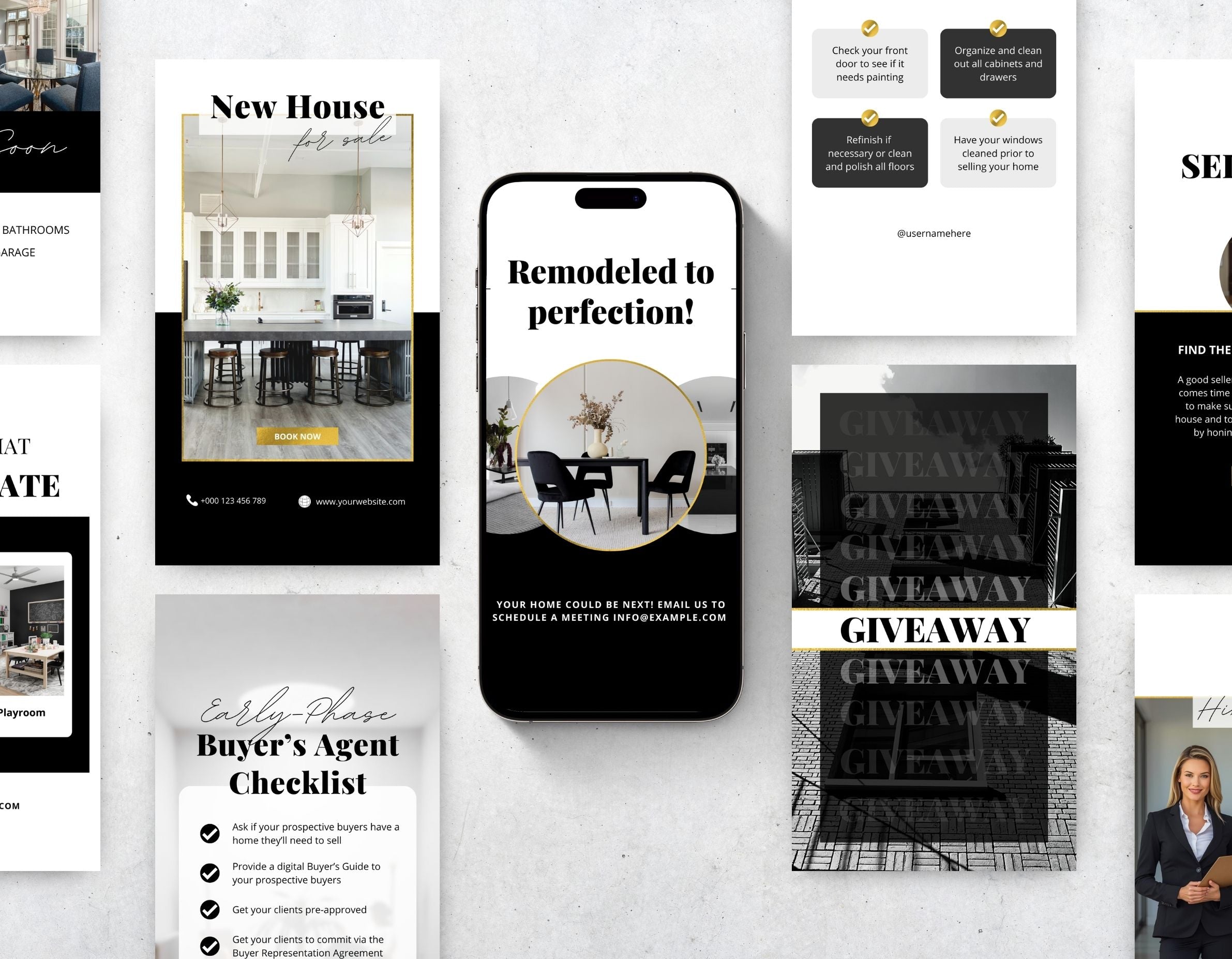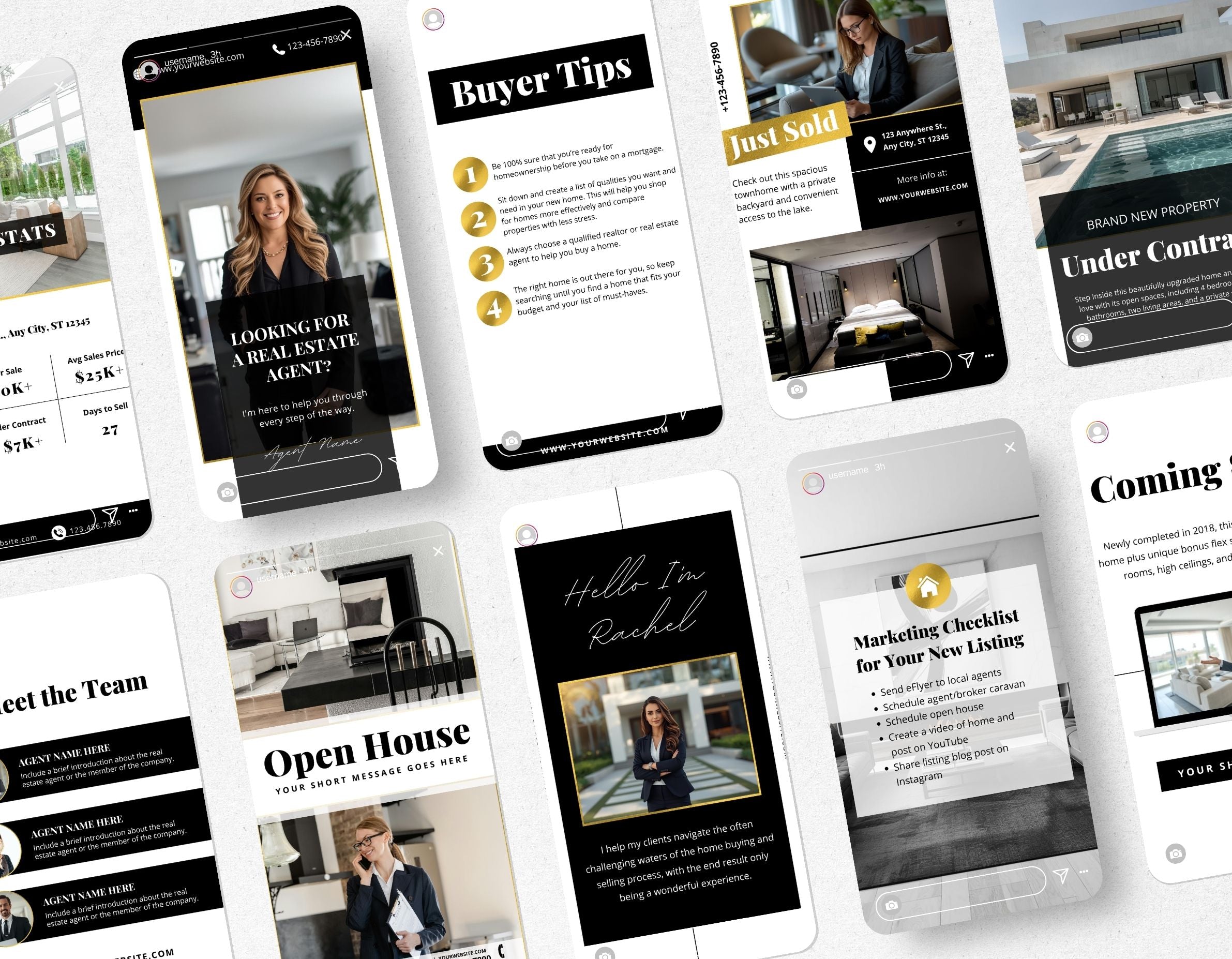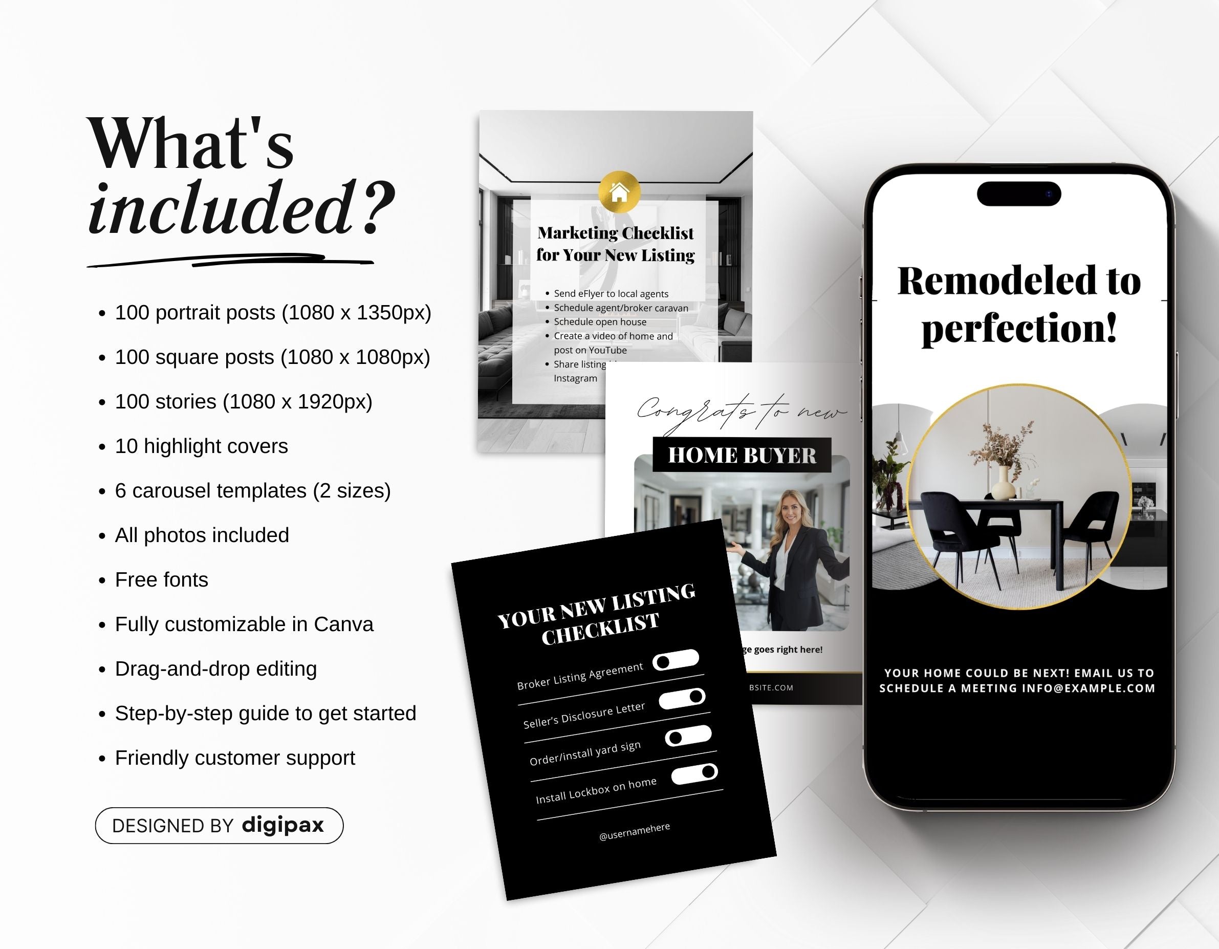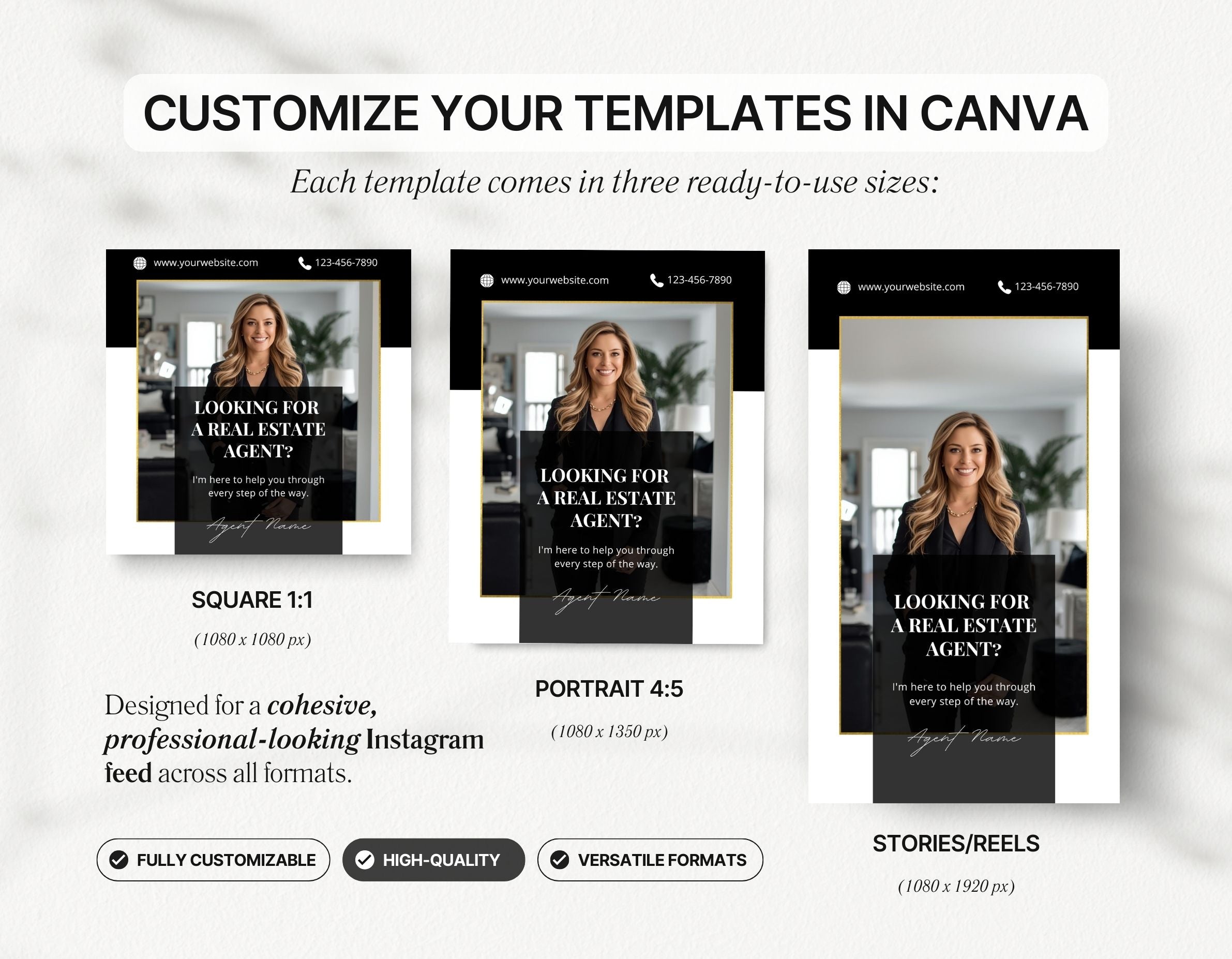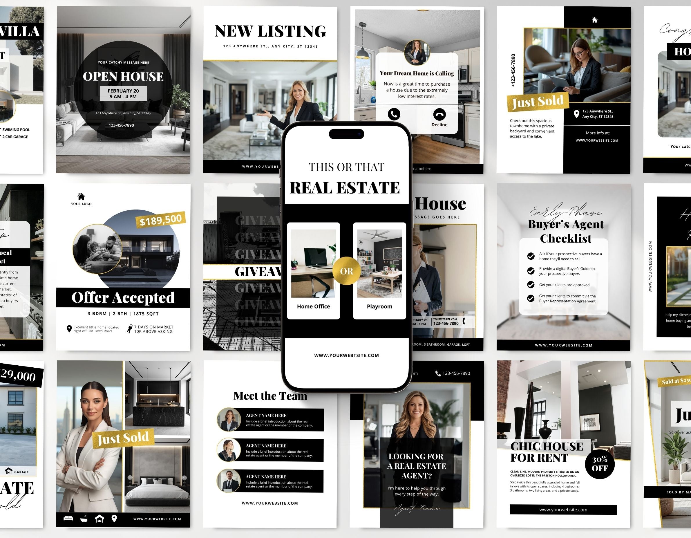 All templates are fully editable in Canva, adjust the text, update colors, add your branding, and replace photos to match your real estate style.