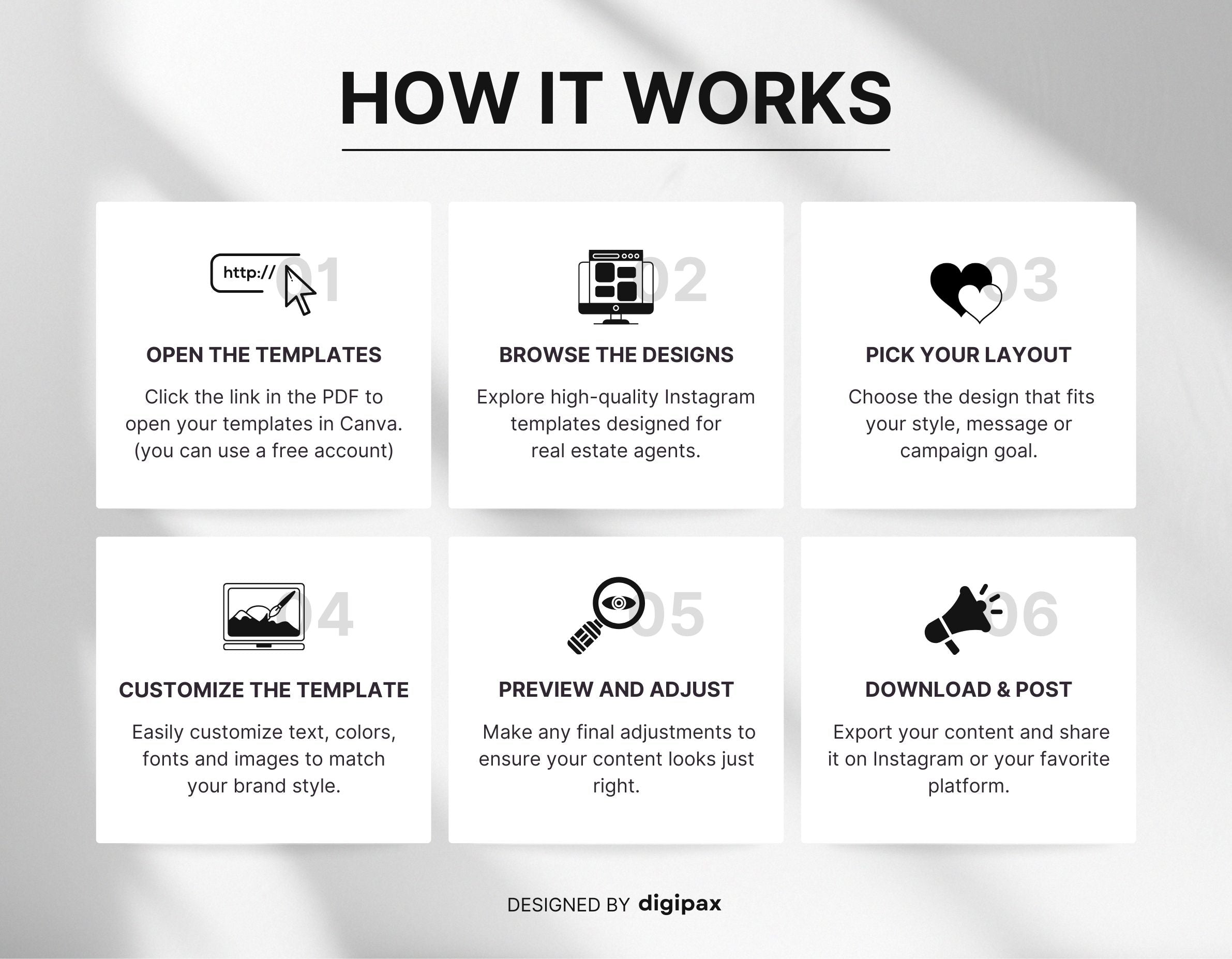 Upon purchase, you will receive a downloadable PDF document containing a shared link. You can use this link to access the templates through your free Canva account.