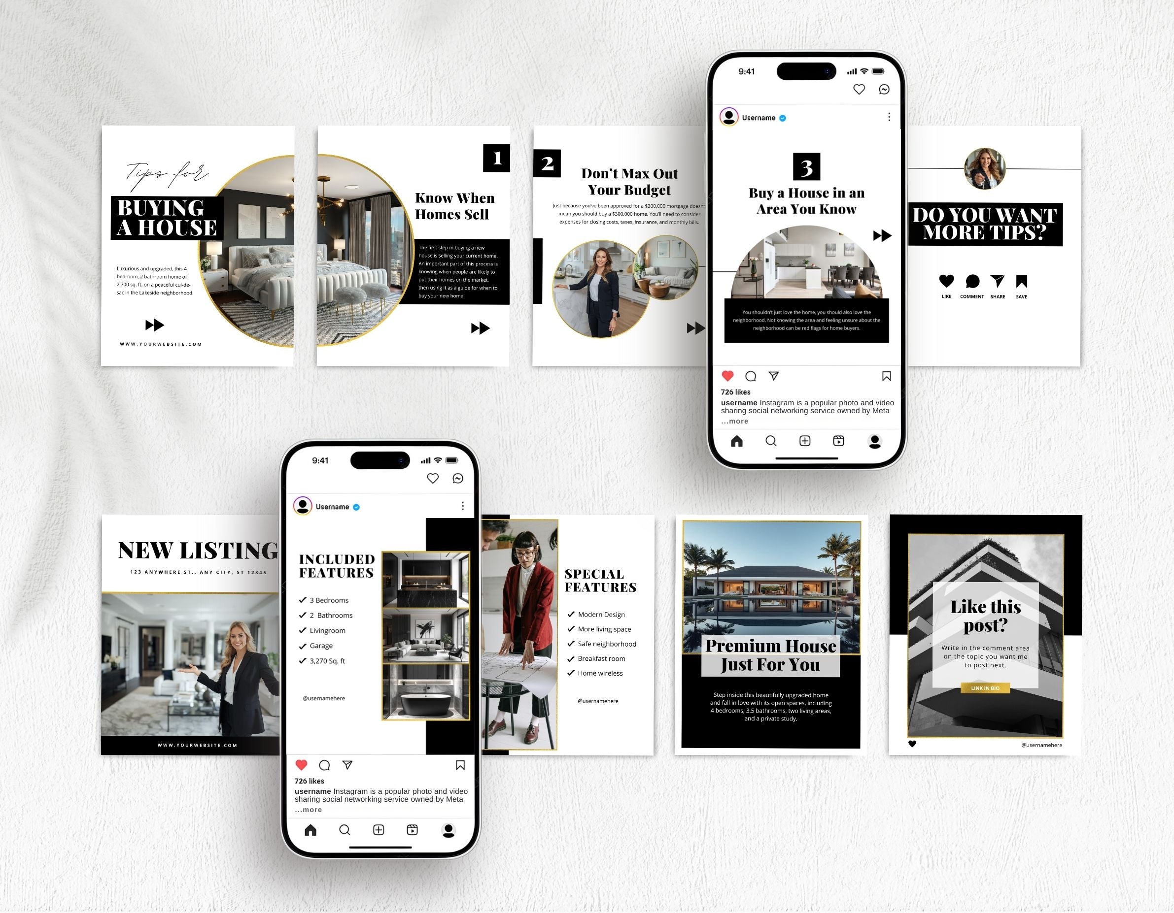 Create a clean and professional Instagram presence with our Real Estate Instagram Templates Bundle Kit, designed for realtors, brokers, property managers, and real estate creators who want a modern black and white aesthetic with refined gold accents.