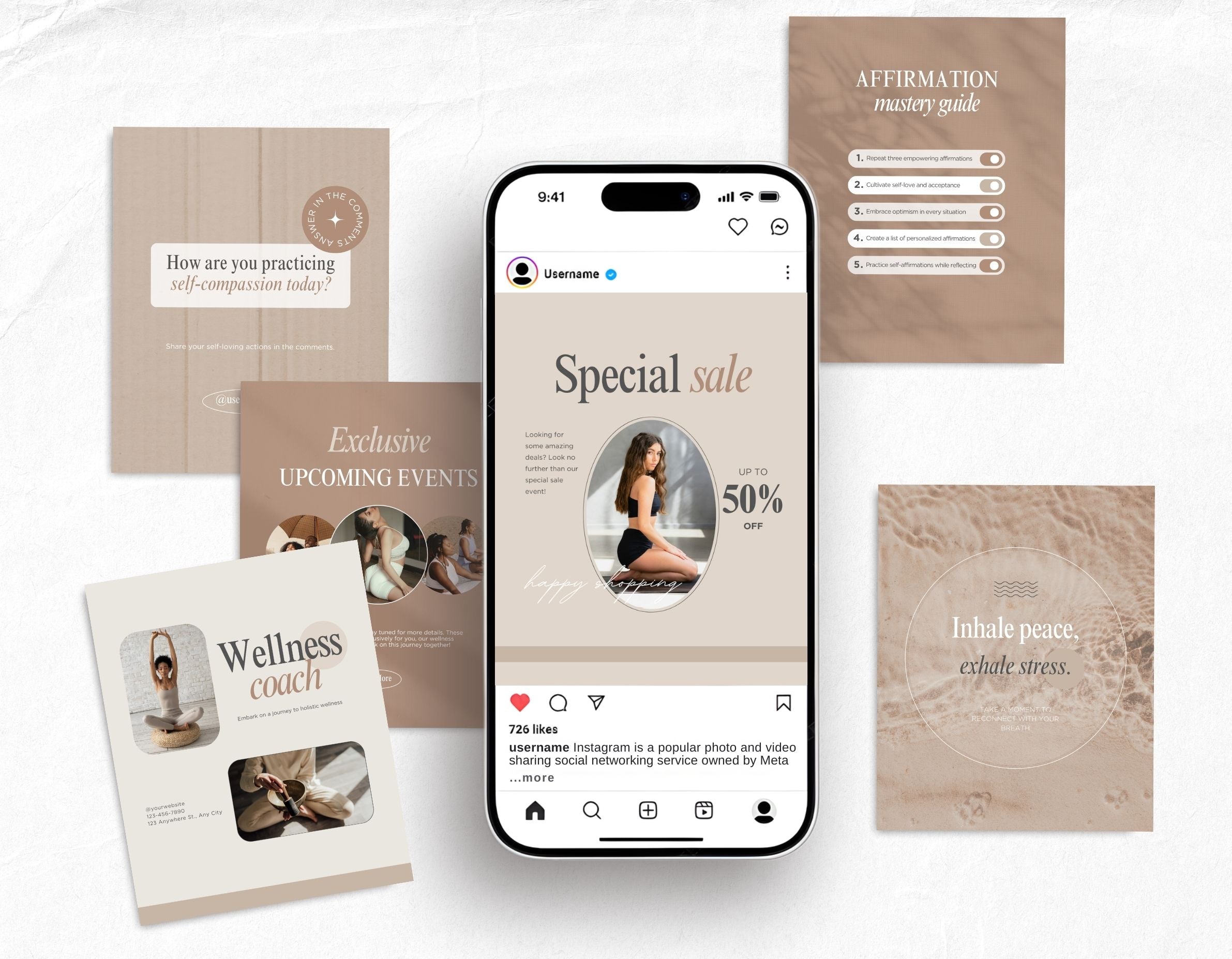 Whether you’re sharing mindfulness reminders, healthy living guidance, or supportive coaching insights, this beige wellness kit helps you stay consistent, professional, and visually cohesive with ease.