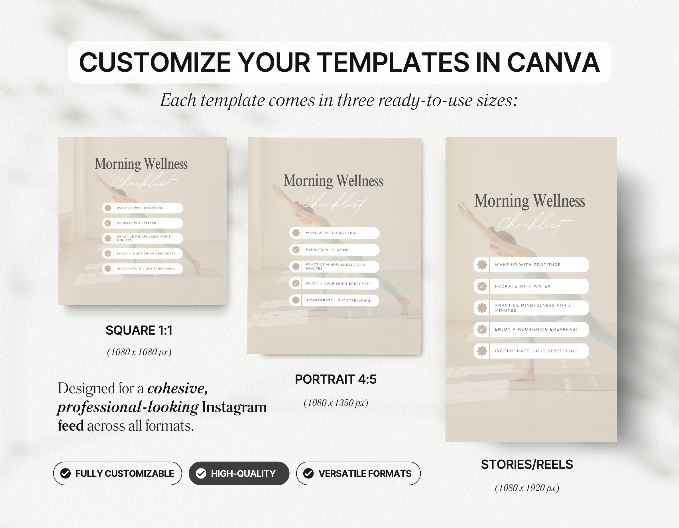 This Canva bundle includes everything you need to design polished wellness posts, portrait layouts, stories, carousels, and highlight covers. It’s ideal for sharing wellness tips, routines, affirmations, program promotions, client updates, and lifestyle-focused educational content.