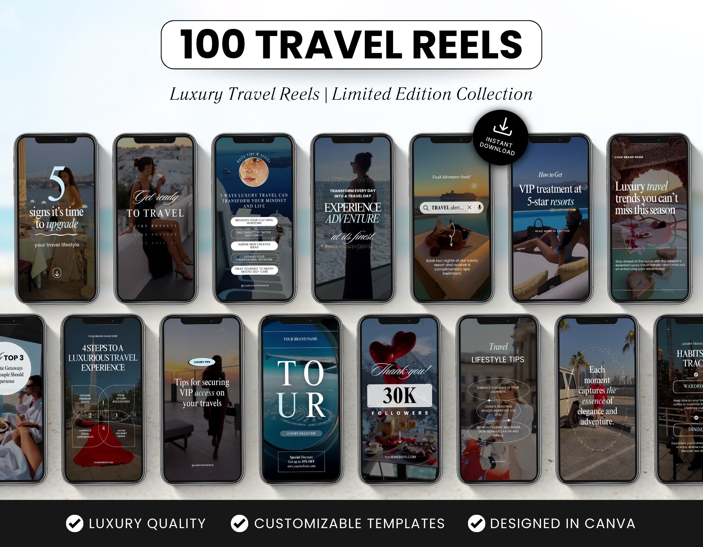 Make your travel content shine with this exclusive collection of 100 Luxury Travel Reels Templates. Save time, impress your audience, and share your adventures with stunning visuals that reflect your unique style.