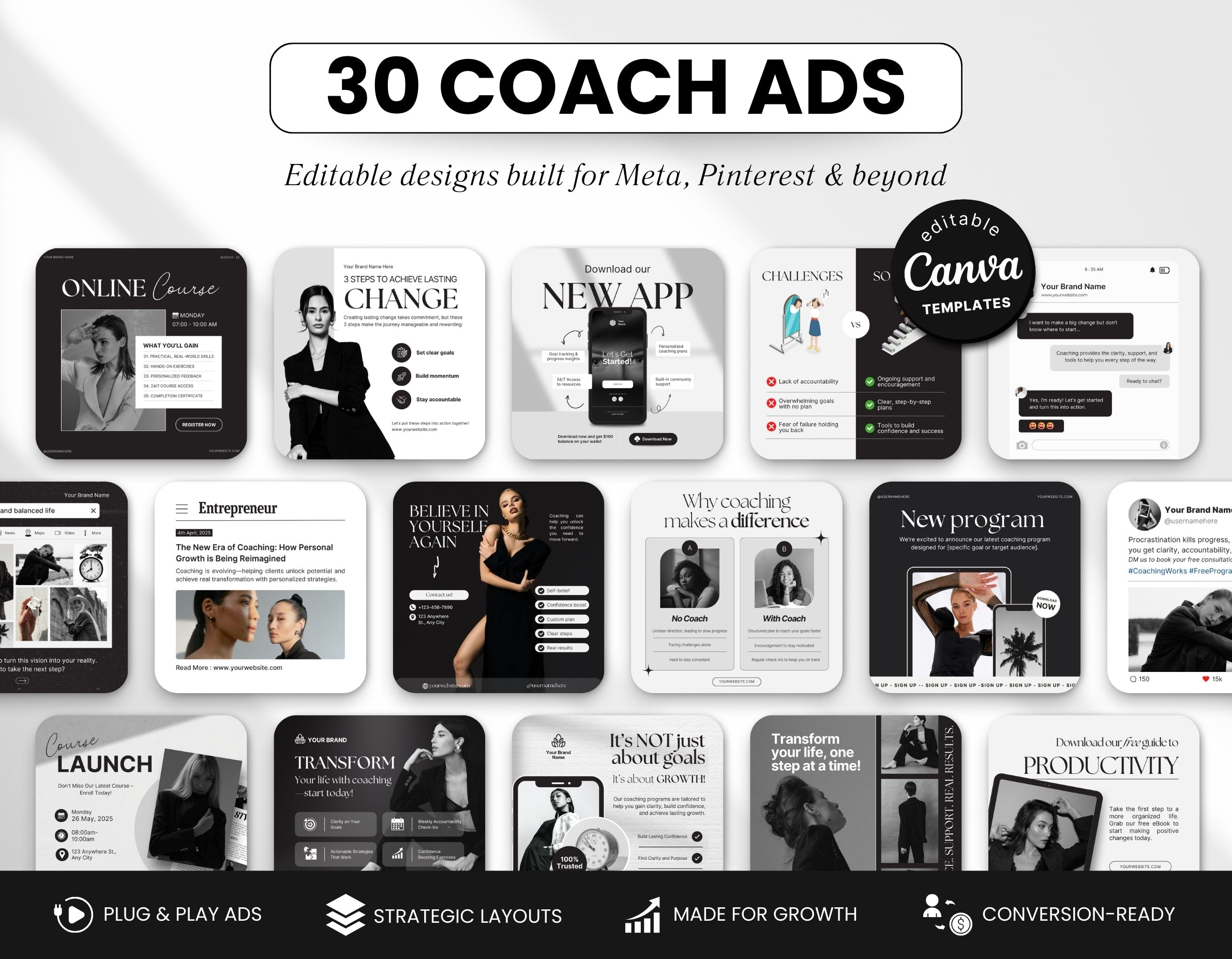 Create professional Meta ads with our 30 Coach Static Ad Templates, perfect for business coaches, life coaches, and online entrepreneurs.