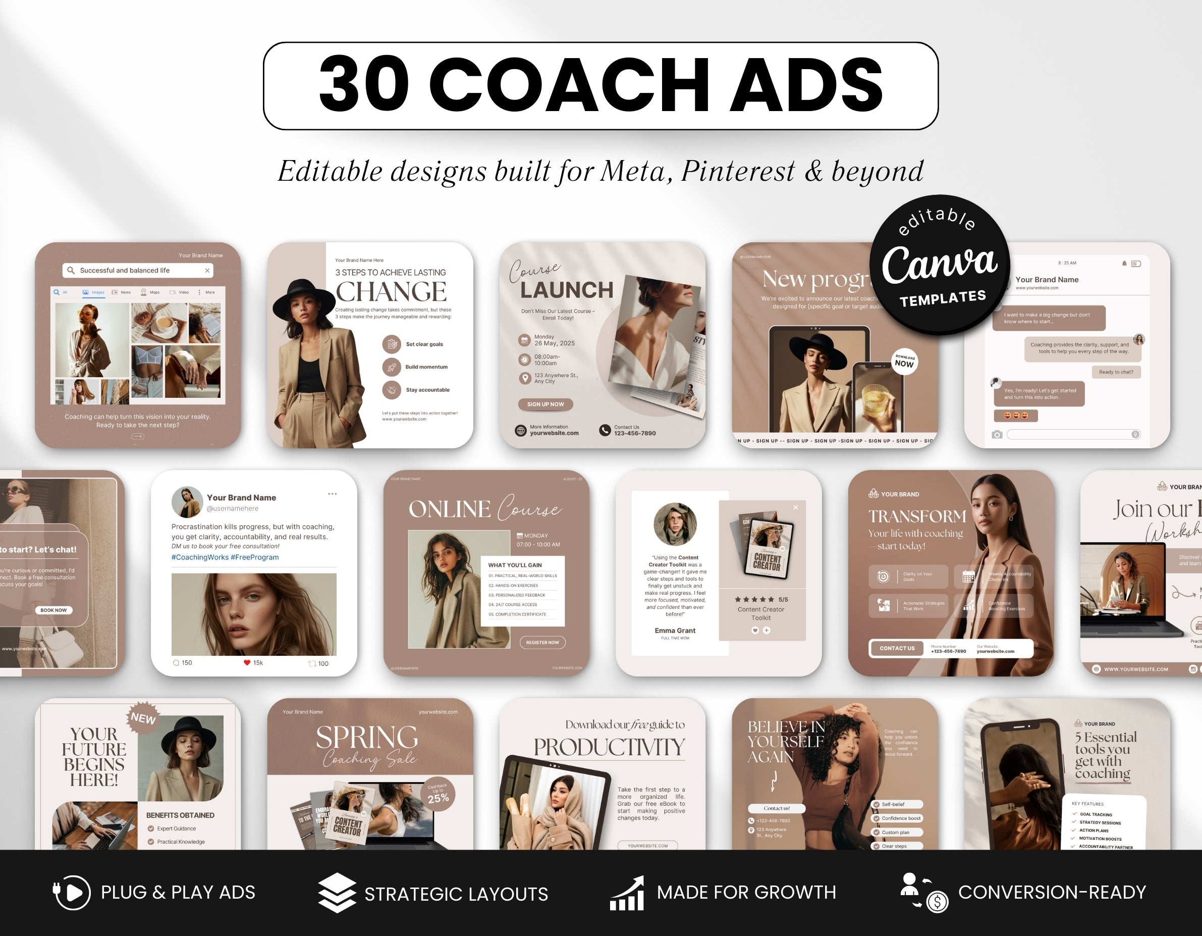 Create professional Meta ads with our 30 Coach Static Ad Templates, perfect for business coaches, life coaches, and online entrepreneurs.