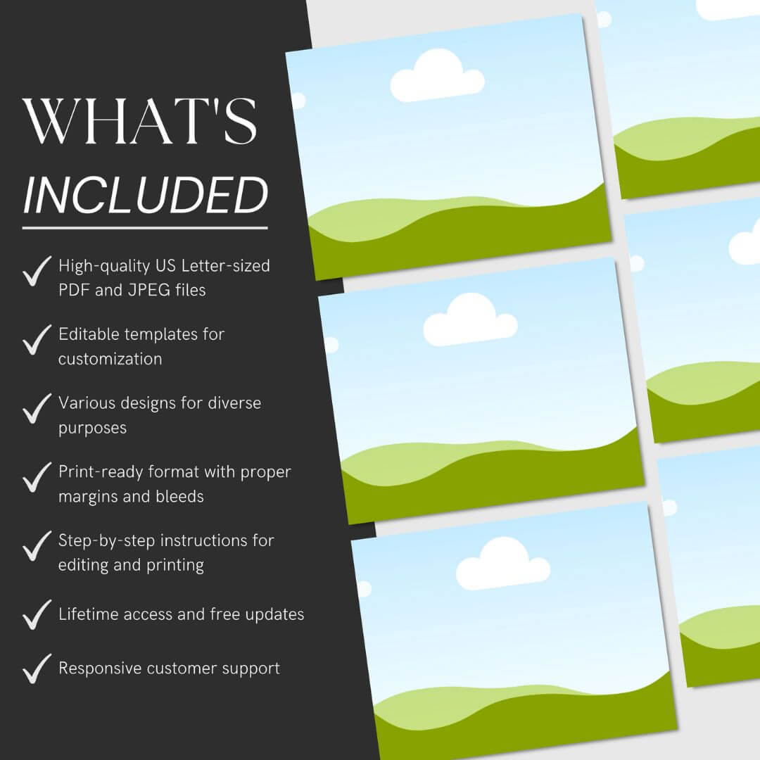 - You may not use our product listing images or descriptions when reselling these templates. You are responsible for creating your own marketing materials.