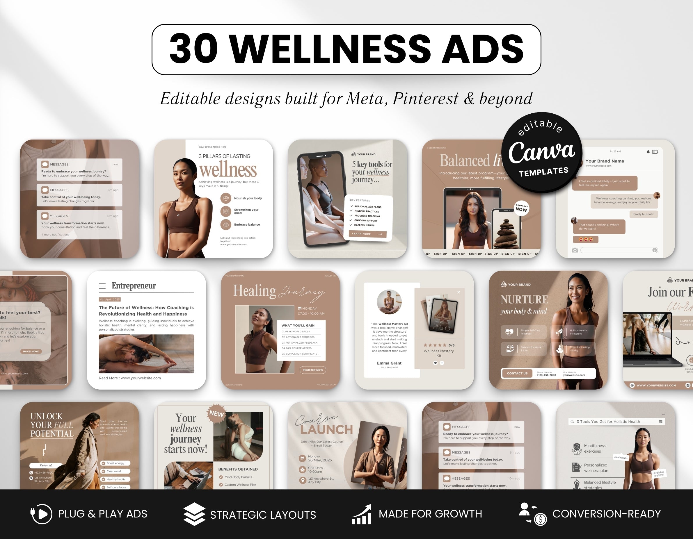 Create eye-catching Meta ads with our 30 Wellness Static Ad Templates, designed for wellness coaches, holistic health practitioners, and health-focused entrepreneurs.